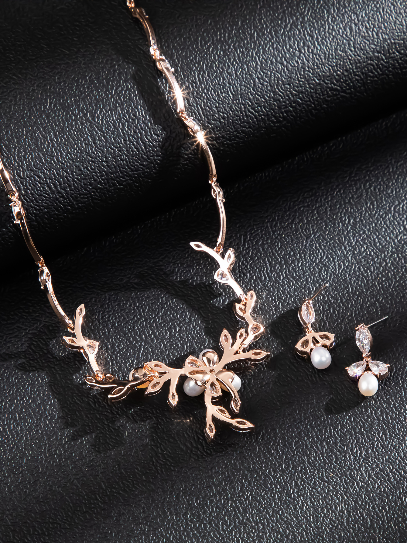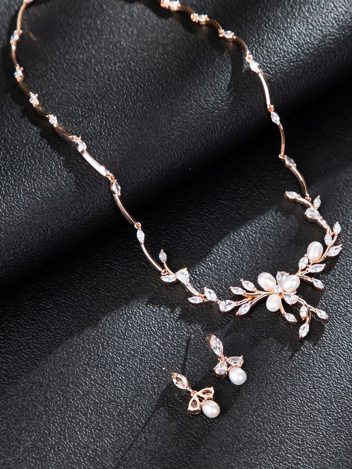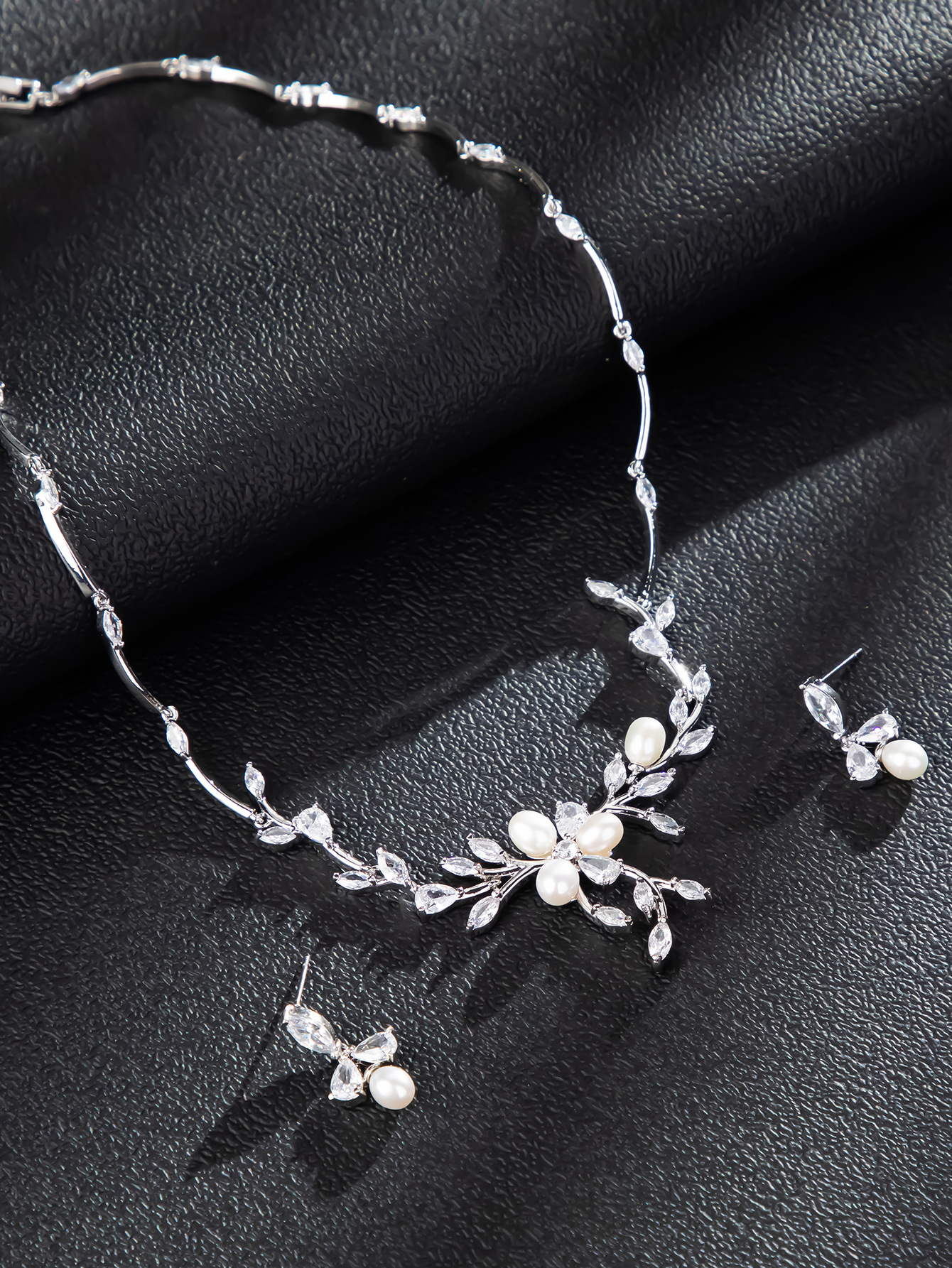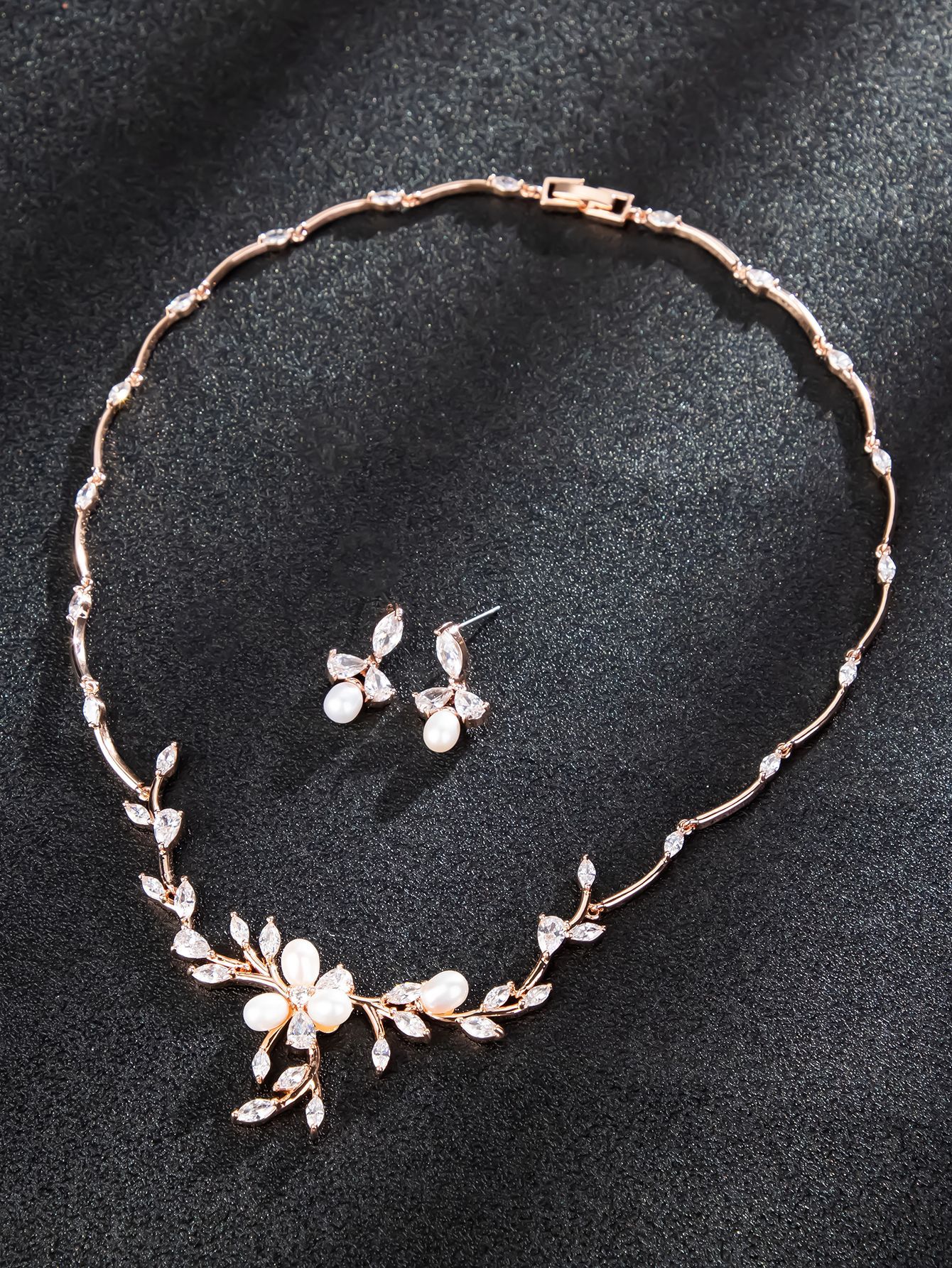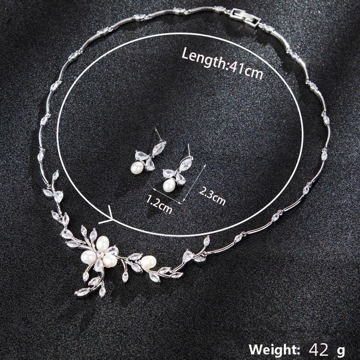 Sweet Pearl Zircon Ear Stud Necklace Jewelry Suit