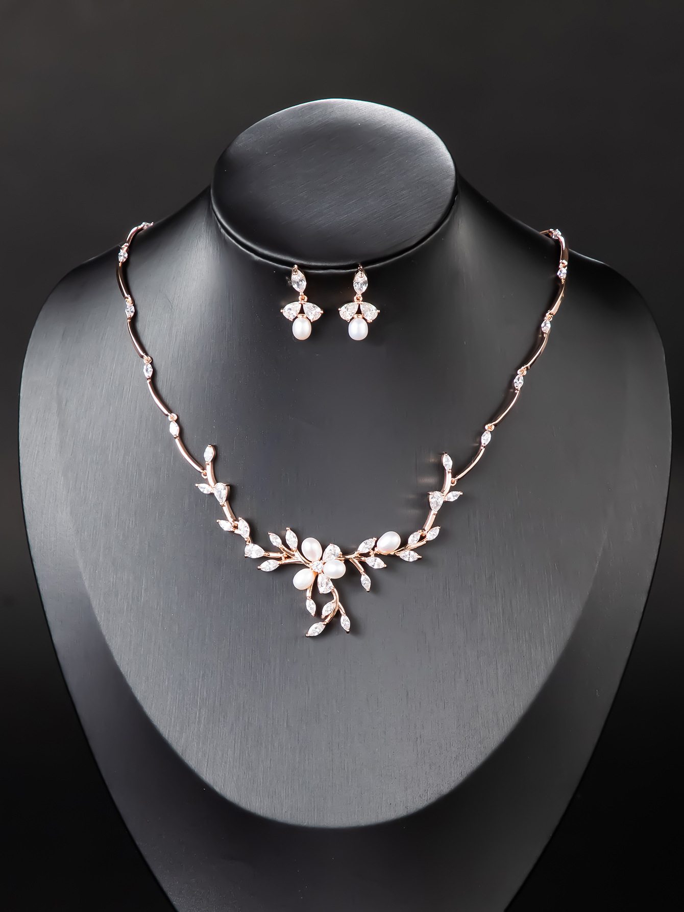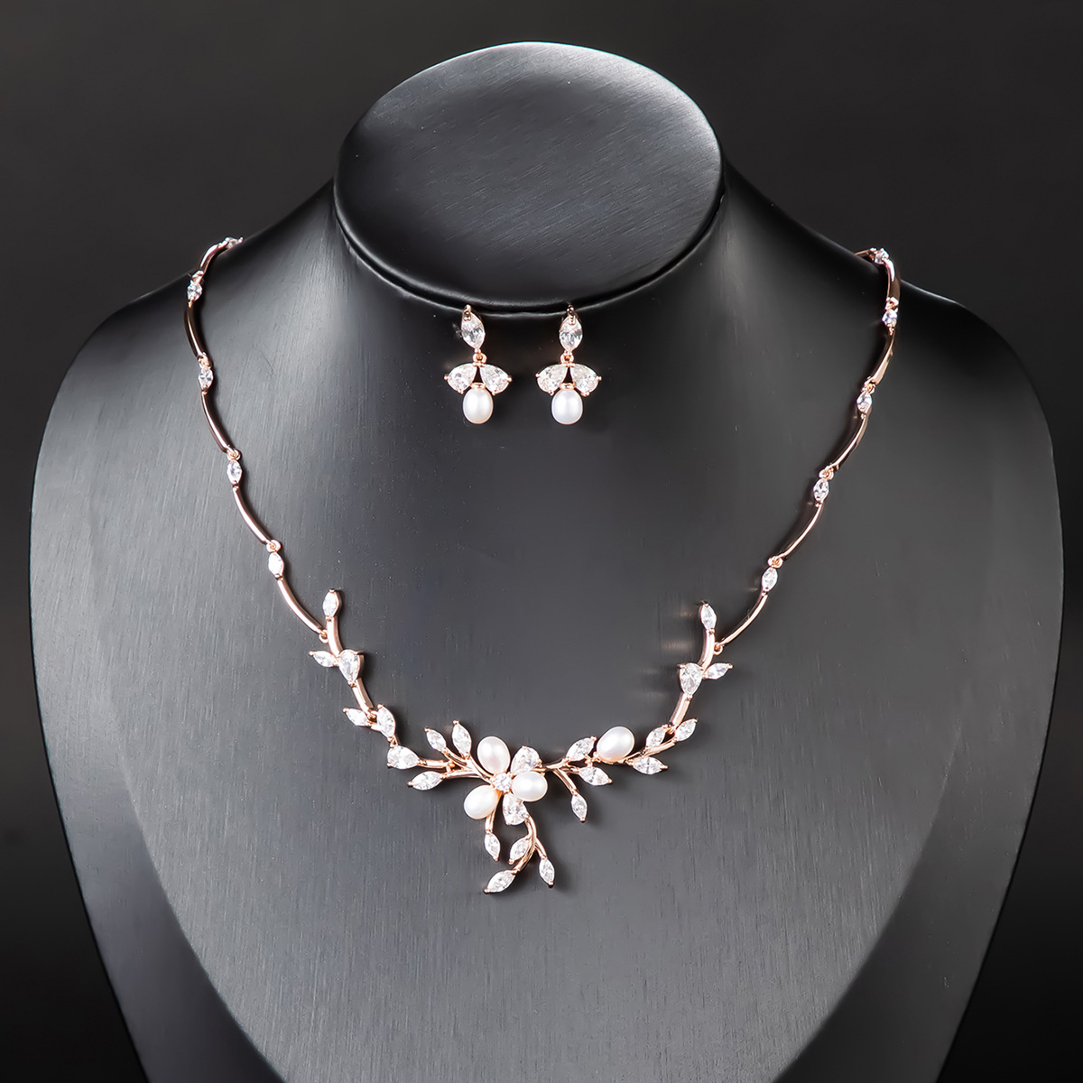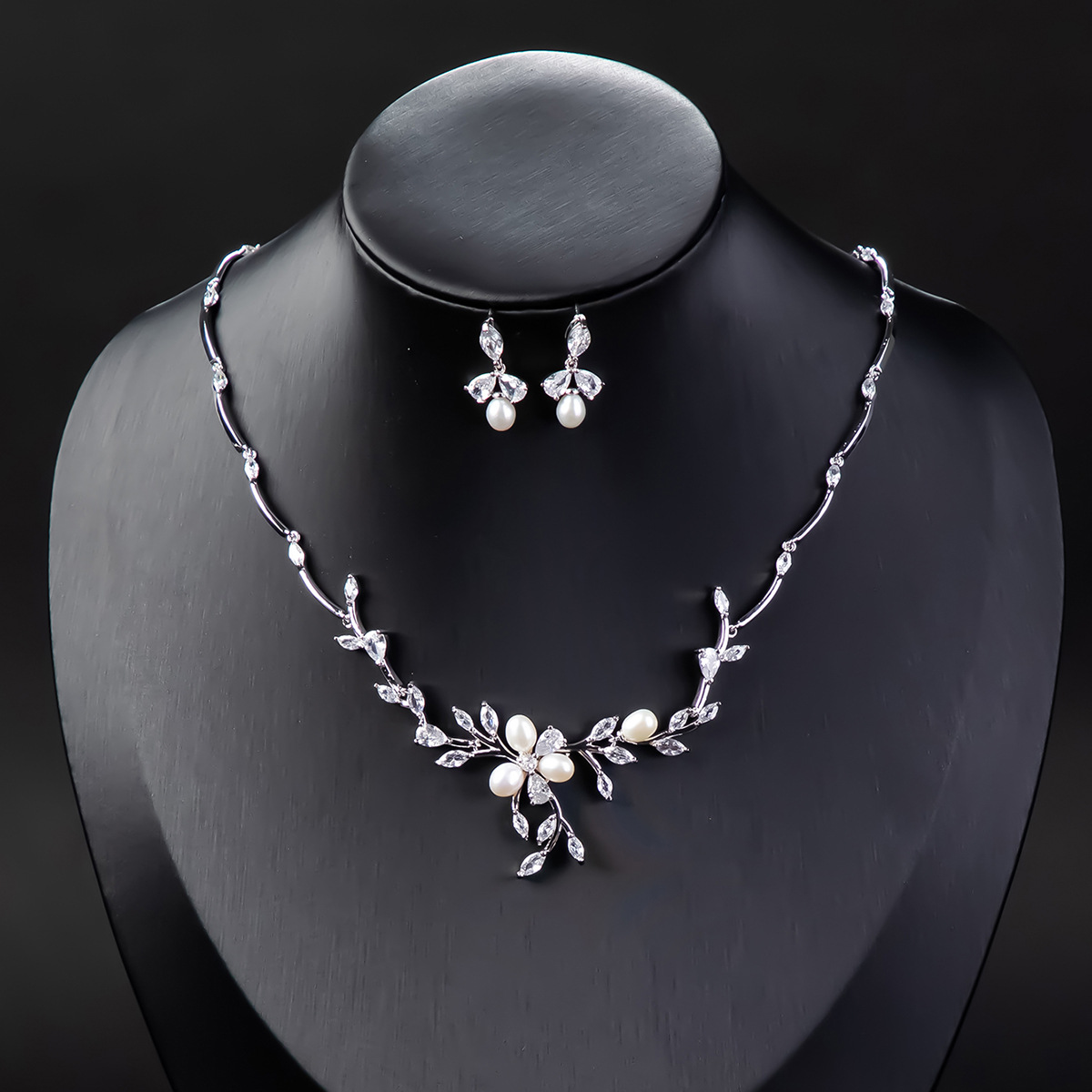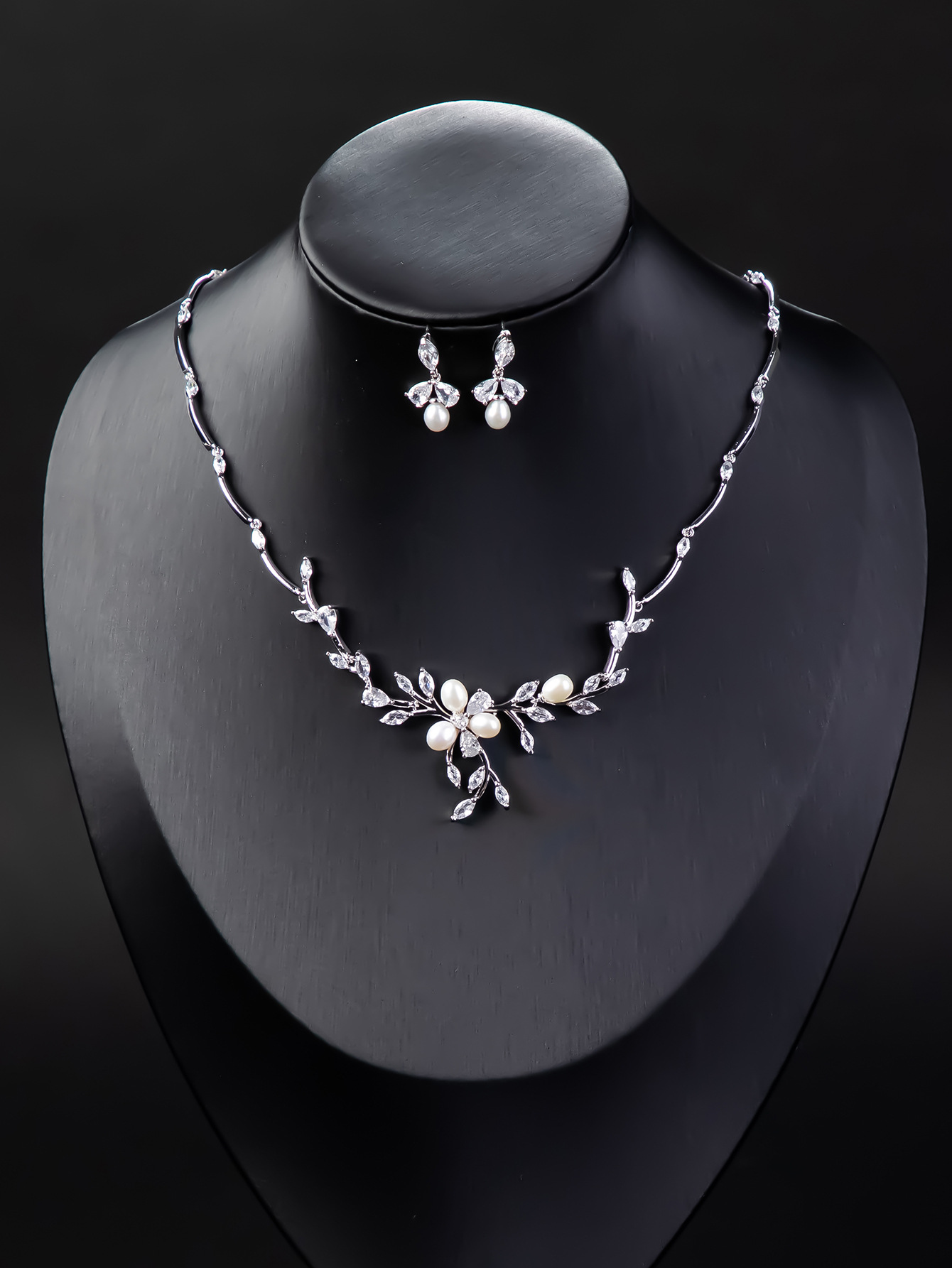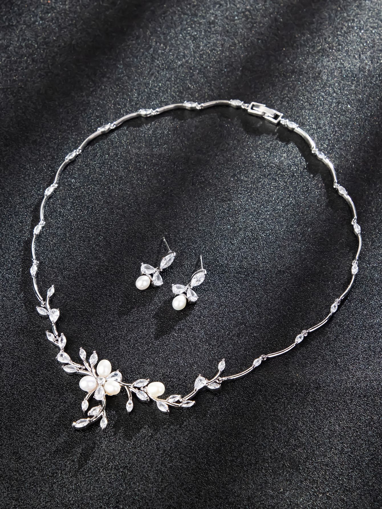 Sweet Pearl Zircon Ear Stud Necklace Jewelry Suit